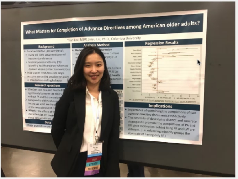 随后,依凡介绍了在芝加哥大学期间由实践、课程与研究助理构成的充实的MSW生活图景,硕士期间的问卷设计与制作经历让她走进了学术大门,愈发找寻到到研究的乐趣。再经过明确的职业规划之后,选择进一步攻读哥伦比亚大学社会工作博士,层层递进研究推进计划体现出她训练有素的学术品质,硕博期间已取得一系列研究成果。硕士期间获得芝大社会服务与管理学院专项奖学金、C. W. Chan奖学金,并先后在芝大医学院、精神健康和文化实验室担任研究助理。博士期间获得全额奖学金、Phyllis & Joseph Caroff奖学金,其独立研究项目多次获得哥大亚洲研究中心专款经费资助。目前已在临终关怀领域以第一作者或主要作者发表多篇论文,期刊包括《Journal of Pain and Symptom Management》(SCI);《OMEGA-Journal of Death and Dying》(SSCI)、《Aging and Mental Health》(SSCI)等,并多次在美国老年学学会、社会工作学会学术会议上进行交流。同时,她有七项研究先后在美国老年学会大会上展示(五项一作)。她目前还是哥大中国中心、哥大人口研究中心、Sasakawa社会政策基金会、及美国老年社会工作学会的研究员。